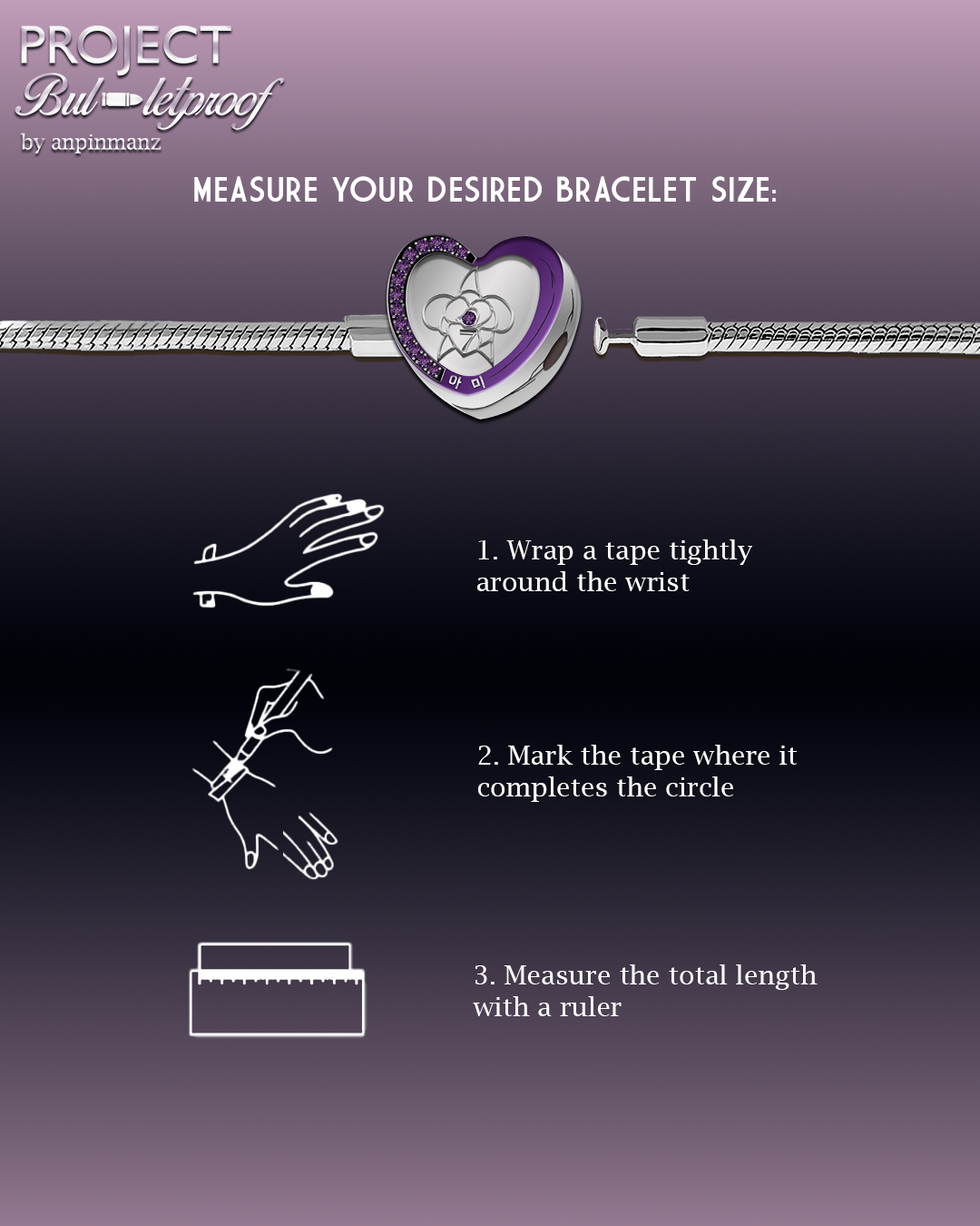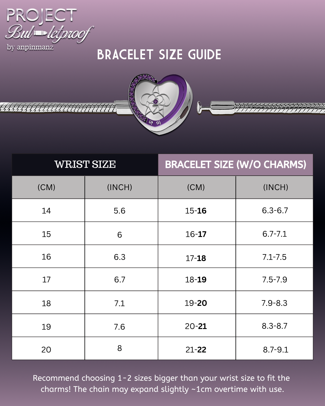 Includes 5 Purple group song charms + Project Bulletproof clasp bracelet (of selected sizes)