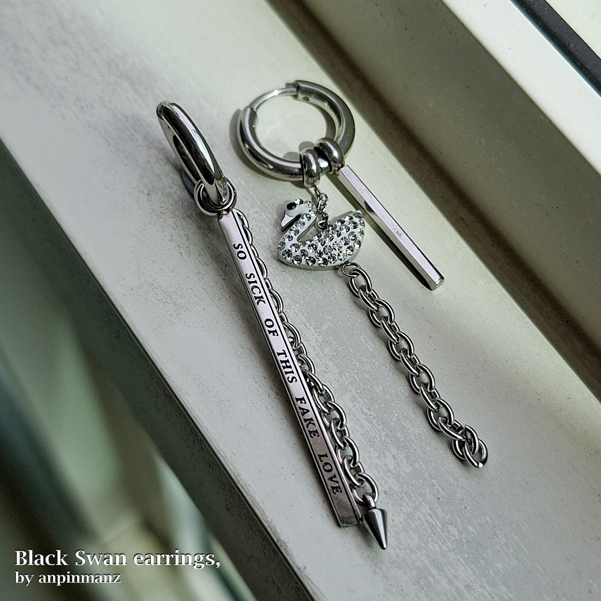 - White/black gemstones inlayed onto the swan, with 'so sick of this fake love' lasered onto the earring charm